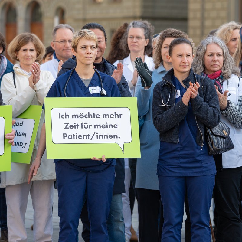 Bern, 21. Februar 2025: Die gute medizinische Versorgung von Menschen und Tieren in der Schweiz ist gefährdet. Denn die Arbeit wird für Ärztinnen, Apotheker, Chiropraktorinnen, Zahnärzte und Tierärztinnen zunehmend schwieriger. Ihre Berufsverbände schlagen nun Alarm. Sie präsentierten auf dem Bundesplatz acht gemeinsame Forderungen gegen den Nachwuchs- und Fachkräftemangel. So sollen unter anderem die Anzahl Studienplätze erhöht, die Arbeitsbedingungen verbessert und die administrativen Auflagen reduziert werden.