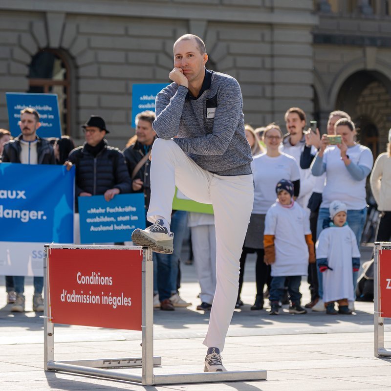 Mit einem Hürdenlauf auf dem Bundesplatz in Bern veranschaulichten die fünf Verbände die Hindernisse in ihren Berufen. Jede der acht Hürden entspricht einer Forderung, um dem Fachkräftemangel zu begegnen. Die Verbände verlangen von der Bundespolitik, dass sie sich für den Abbau der Hürden einsetzen.