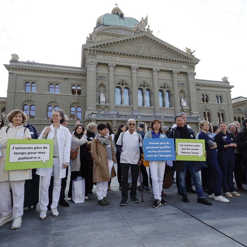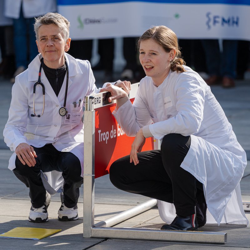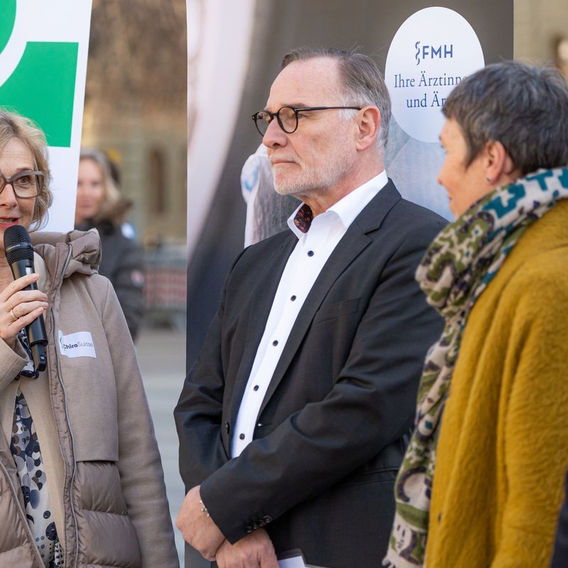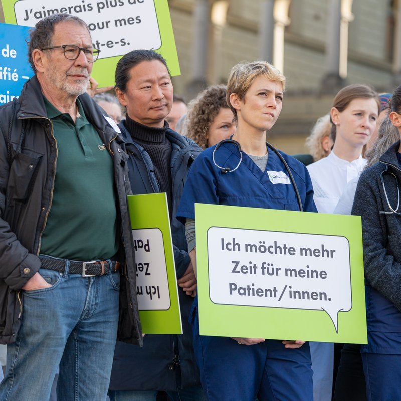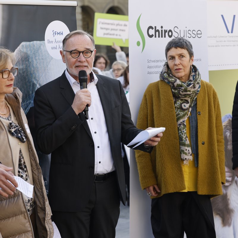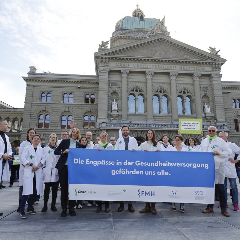 Berne, le 21 février 2025: La bonne prise en charge médicale des personnes et des animaux en Suisse est menacée. En effet, le travail des médecins, des pharmacien-ne-s, des chiropraticien-ne-s, des dentistes et des vétérinaires devient de plus en plus difficile. Leurs associations professionnelles tirent la sonnette d'alarme. Elles ont présenté aujourd'hui sur la Place fédérale huit revendications communes contre le manque de relève et de personnel qualifié. Il s'agit entre autres d'augmenter le nombre de places d'études, d'améliorer les conditions de travail et de réduire les charges administratives.