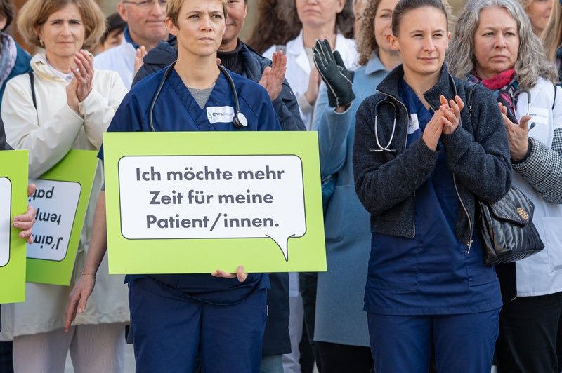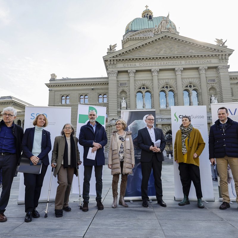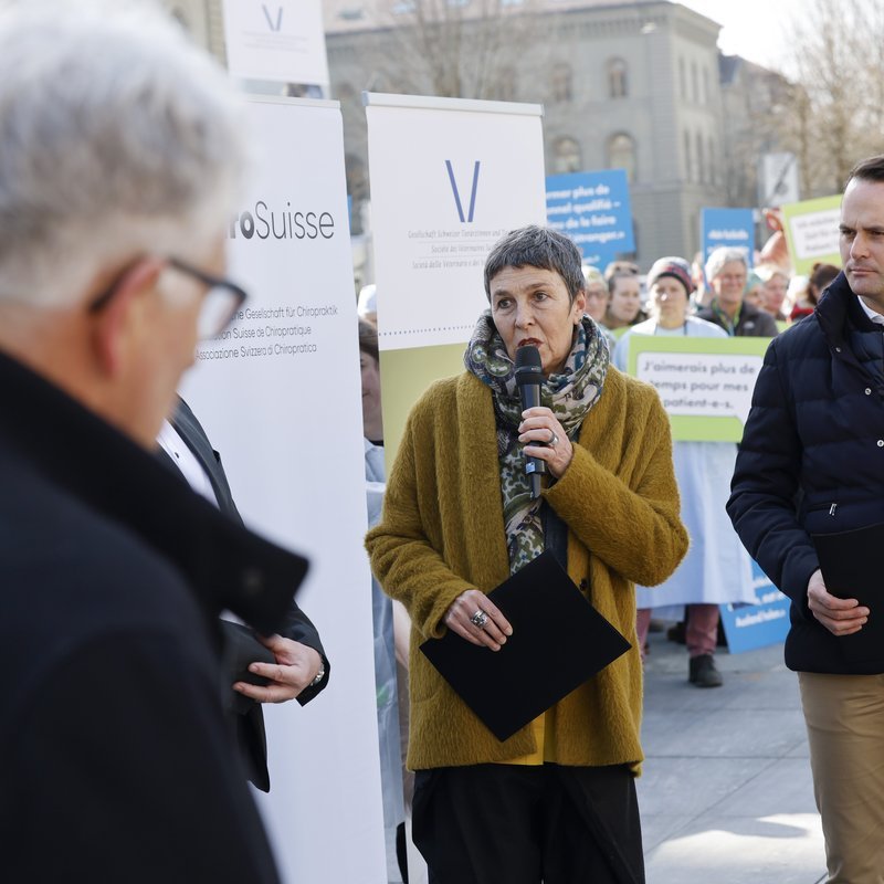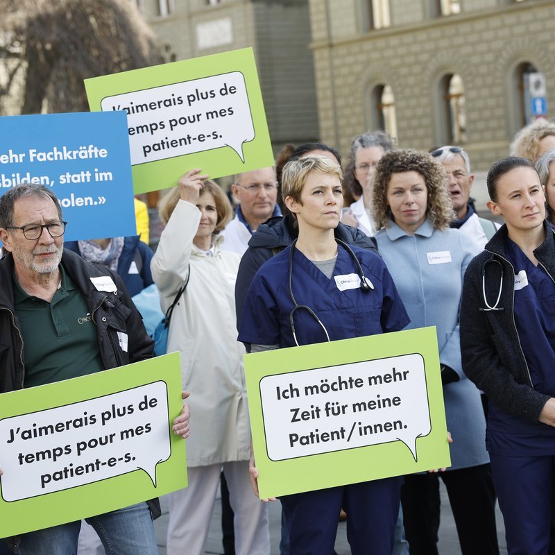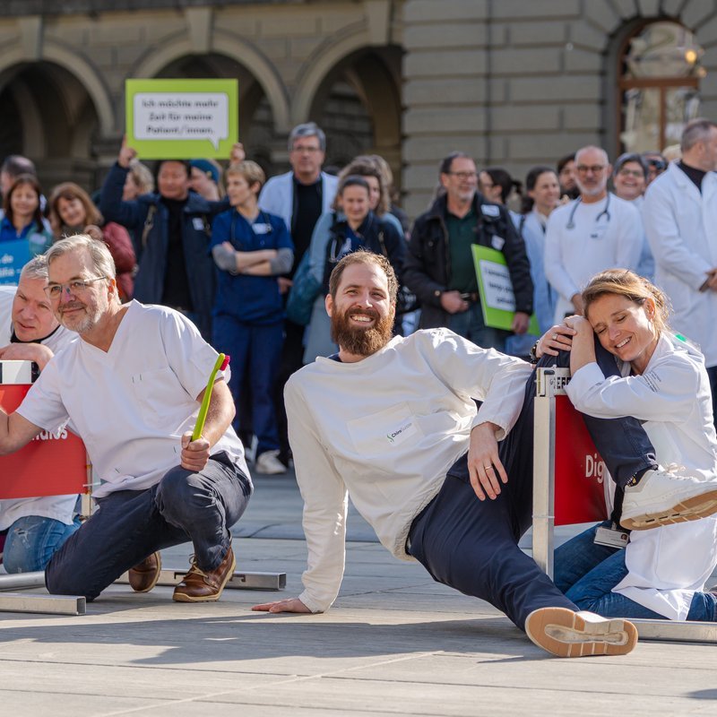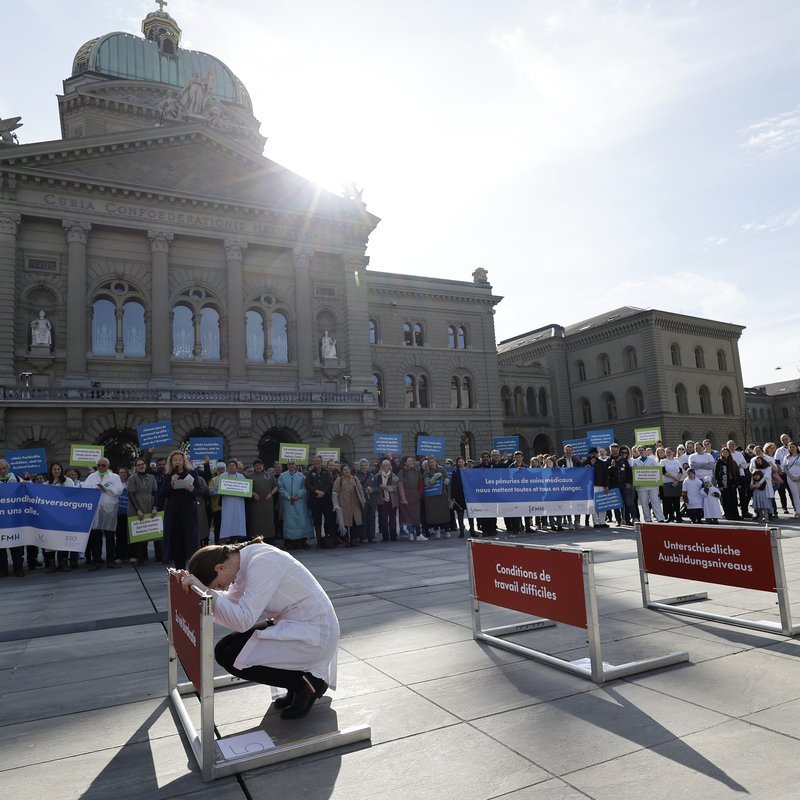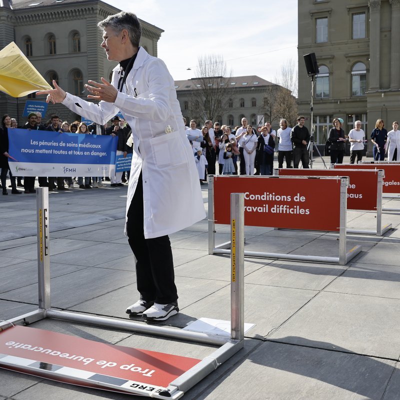 Berne, le 21 février 2025: La bonne prise en charge médicale des personnes et des animaux en Suisse est menacée. En effet, le travail des médecins, des pharmacien-ne-s, des chiropraticien-ne-s, des dentistes et des vétérinaires devient de plus en plus difficile. Leurs associations professionnelles tirent la sonnette d'alarme. Elles ont présenté aujourd'hui sur la Place fédérale huit revendications communes contre le manque de relève et de personnel qualifié. Il s'agit entre autres d'augmenter le nombre de places d'études, d'améliorer les conditions de travail et de réduire les charges administratives.
