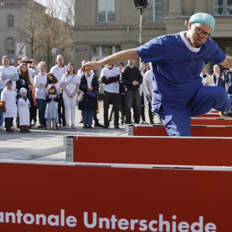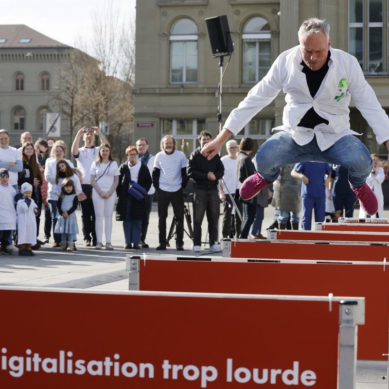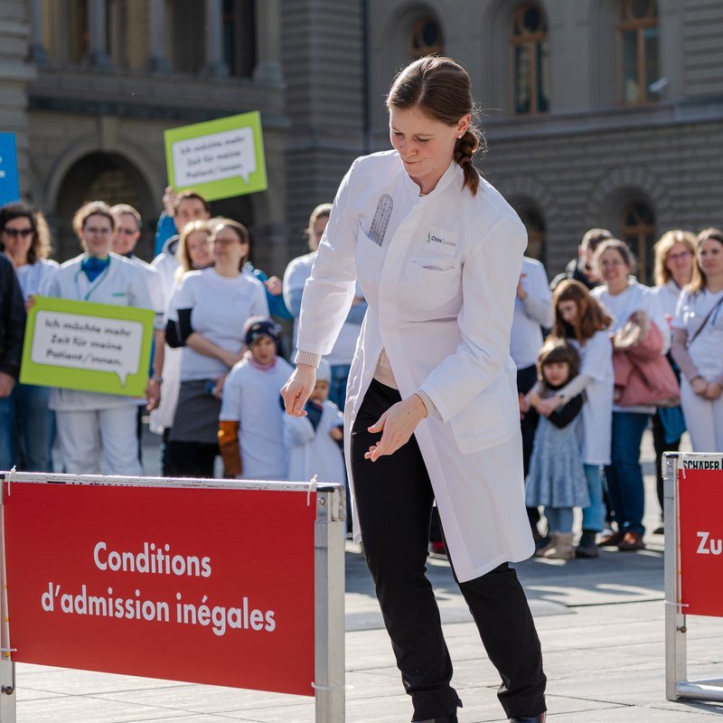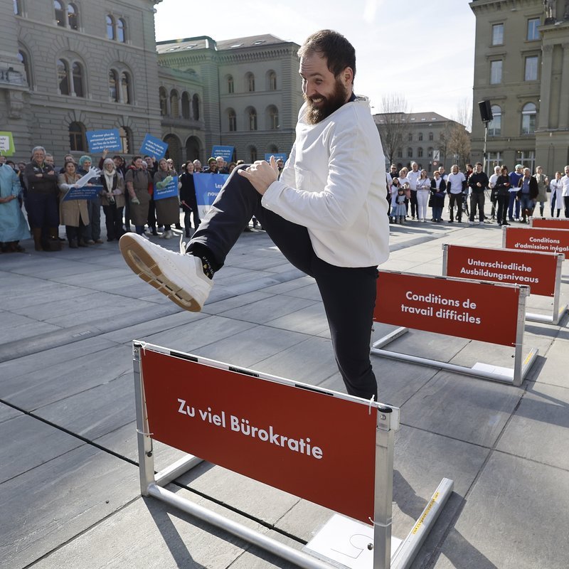 C’est avec une course d'obstacles sur la Place fédérale à Berne que les cinq associations ont illustré les obstacles rencontrés dans leurs professions. Chacun des huit obstacles correspond à une revendication pour faire face à la pénurie de personnel qualifiée. Les organisations demandent aux responsables politiques fédéraux de s'engager pour la suppression des obstacles.
